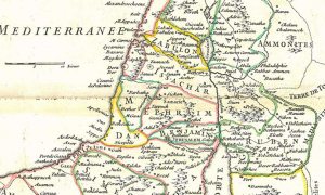 Carte de la Terre Sainte divisée selon les douze tribus d'Israel : où sont exactement marquez les voyages de Jésus-Christ : dressée pour bien entendre l'histoire de la Bible C.B. Glot (17..-18..)