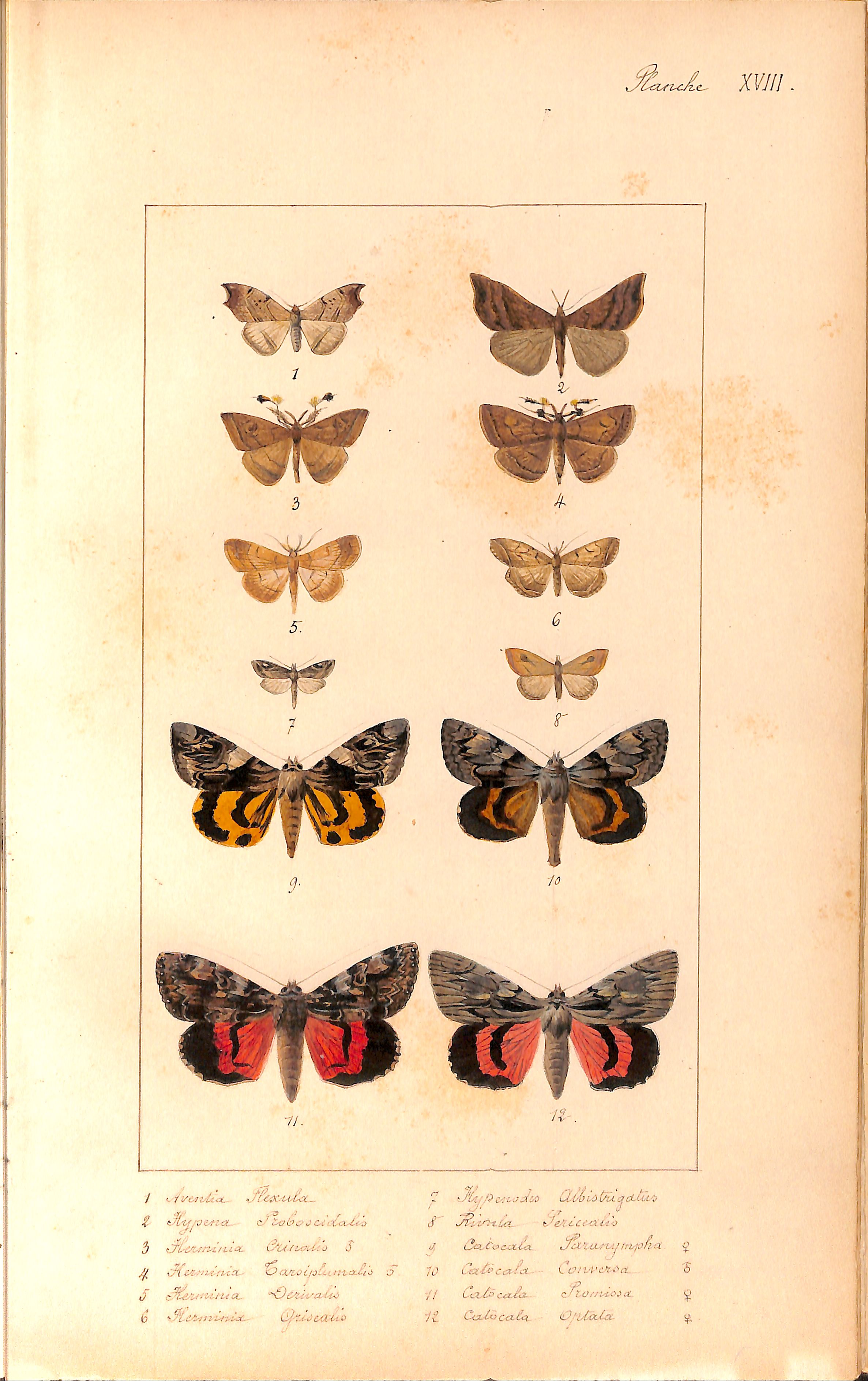 1- Avdentia Flexula. 2-Hypena Proboscidalis. 3-Herminia Crinalis ♂. 4-Herminia Tarsiplumalis ♂. 5-Herminia Derivalis. 6-Herminia Grisealis. 7-Hypenodes Albistrigatus. 8-Rivula Sericealis. 9-Catocala Paranympha ♀. 10-Catocala Conversa ♂. 11-Catalocala Promissa ♀. 12-Catocala Optala ♀ |