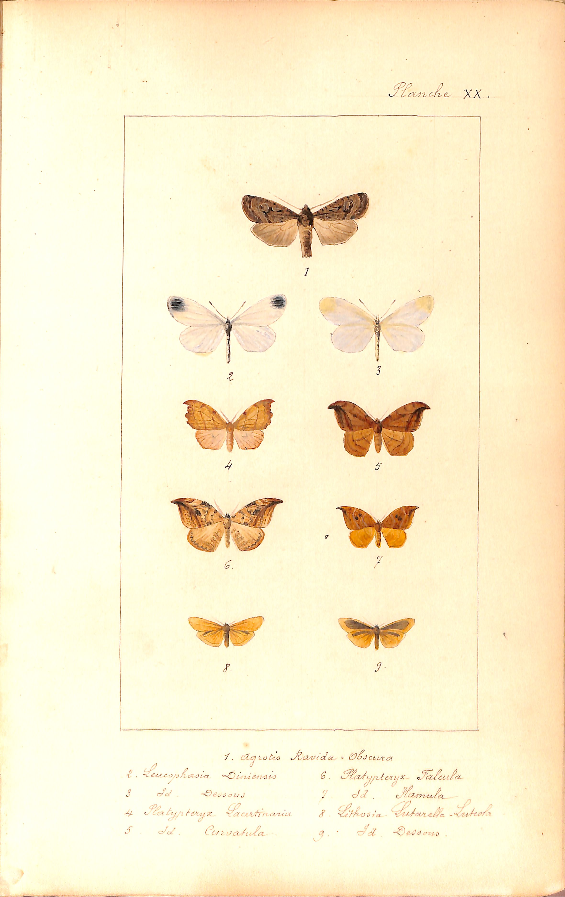 1-Agrotis Ravida Obscura. 2-Leucophasia Diniensis. 3-Leucophasia Dessous. 4-Platypteryx Lacertinaria. 5-Platypteryx Curvatula. 6-Platypteryx Falcula. 7-Platypteryx Hamula. 8-Lithosia Lutarella-Lutcola. 9-Lithosia dessous.