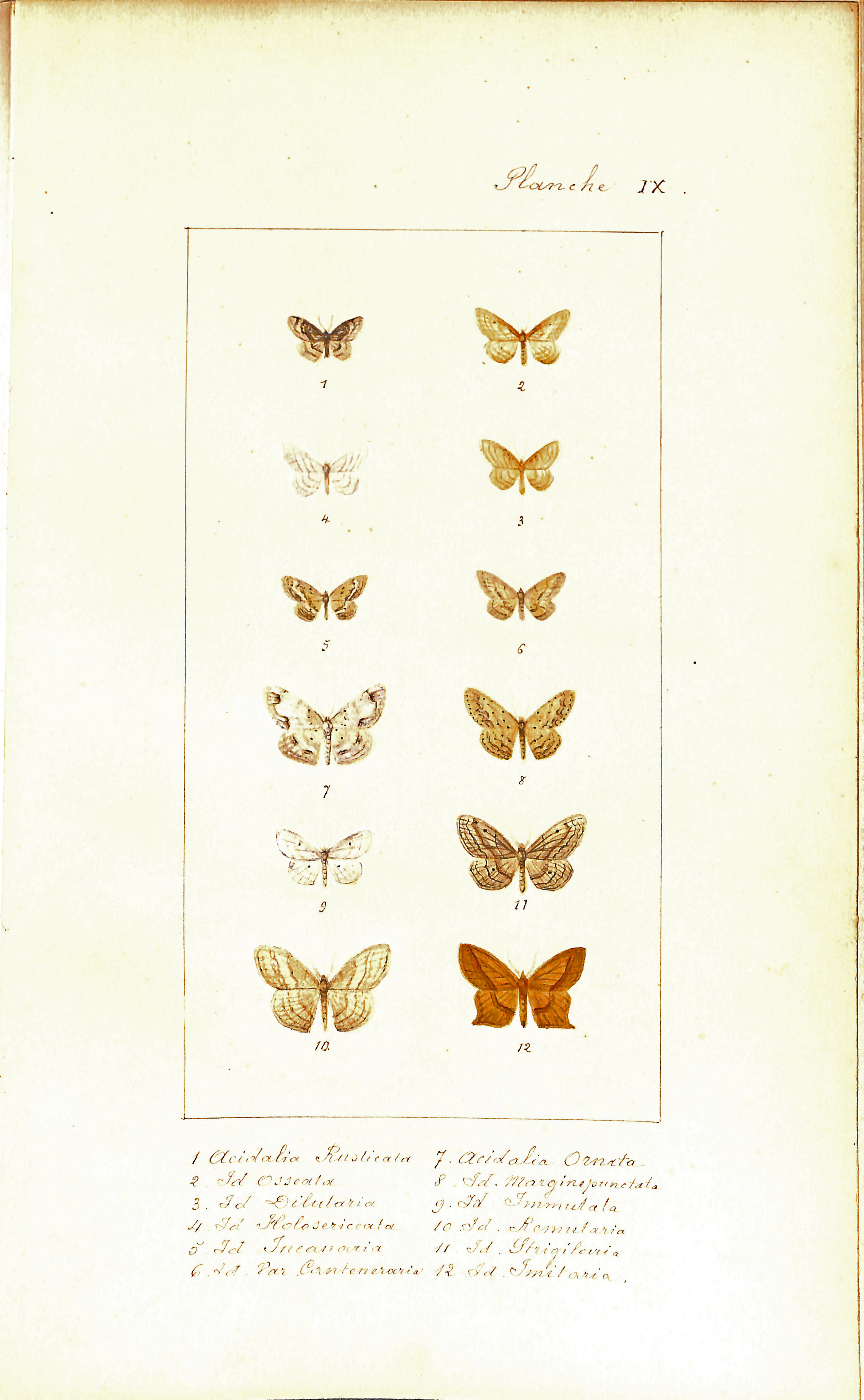 1-Acidalia Rusticata. 2-Acidalia Osseata. 3-Acidalia Dilutaria. 4-Acidalia Holosericea. 5-Acidala Ineanaria. 6-Acidalia var. Canteneraria. 7-Acidalia Ornata. 8-Acidala Marginepunctata. 9-Acidalia Immutata. 10-Acidalia Remutaria. 11-Acidalia Strigillaria. 12-Acidalia Imitaria. |