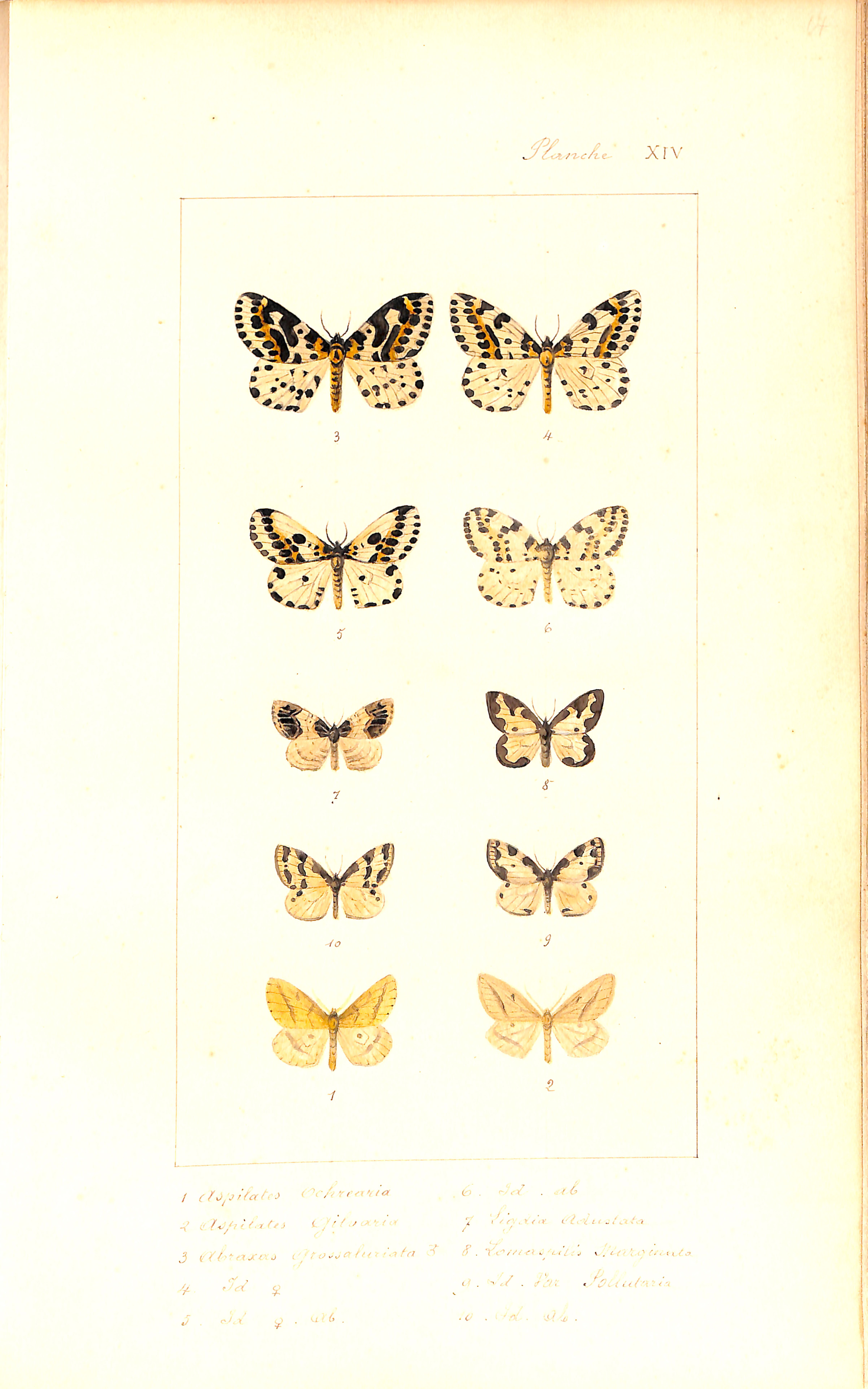 1-Aspilates Ochrearia. 2-Aspilates Gilvaria. 3-Abraxas Grossaluriata ♂. 4-Abraxas Grossaluriata ♀. 5-Abraxas Grossaluriata ♀. 6-Abraxas Grossaluriata ab.♀. 7-Ligdia Adustata. 8-Lomaspilis Marginata. 9-Lomaspilis var. Pollutaria. 10-Lomaspilis ab. |