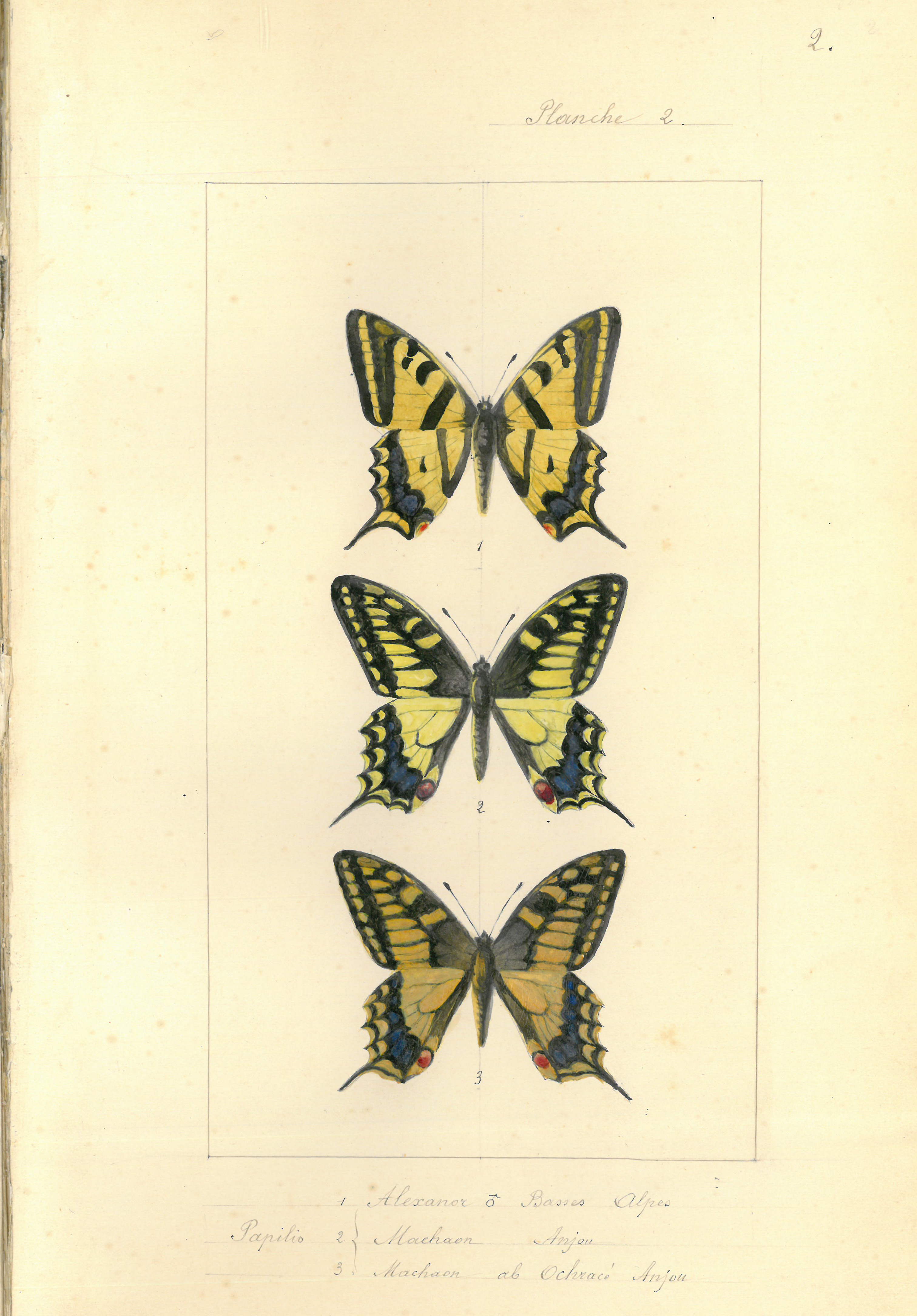 Papilio. 1-Alexanor ♂ (Basses Alpes). 2-Machaon (Anjou). 3-Machaon ab Ochracé (Anjou) |