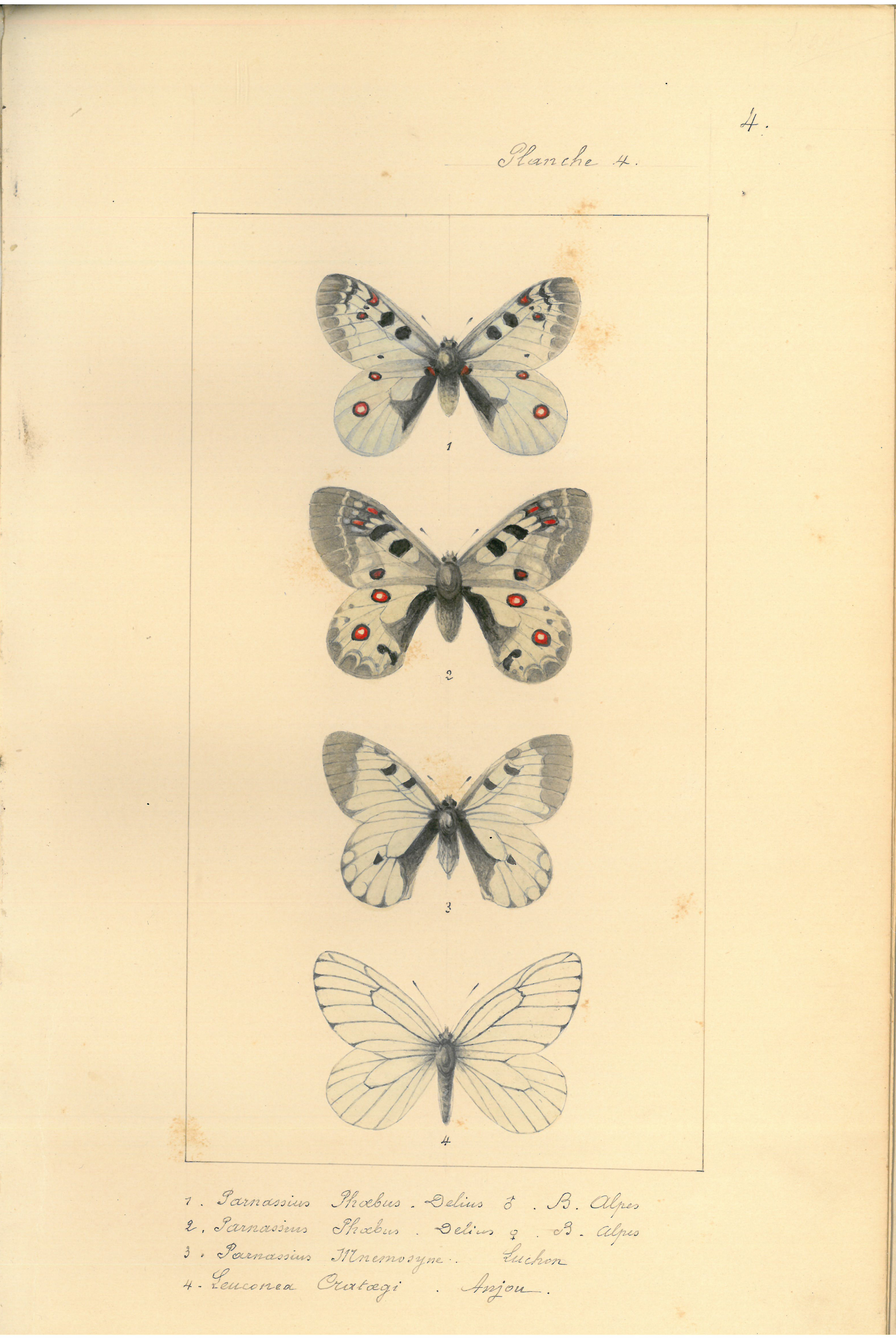 1-Parnassius Phoebus Delius ♂ (B. Alpes). 2-Parnassius Phoebus Delius ♀ (B. Alpes). 3-Parnassius Mnemosyne (Luchon). 4-Leuconea Cratoegi (Anjou)