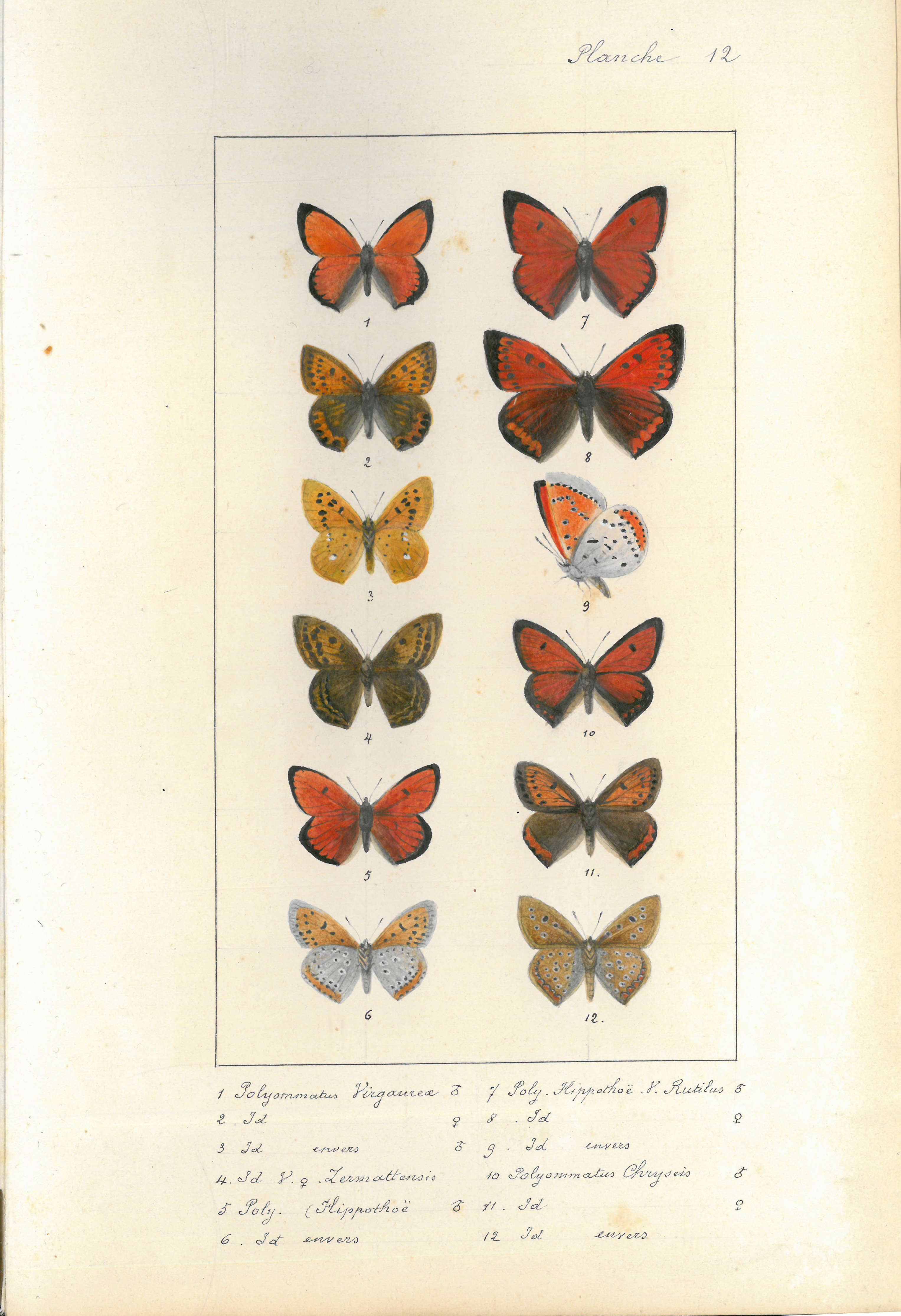 1-Polyommatus Virgaureœ ♂. 2-Polyommatus Virgaureœ ♀. 3-Polyommatus Virgaureœ envers ♂. 4-Polyommatus Virgaureœ ver. ♀ Lermattensis. 5-Poly Hippothoë ♀. 6-Poly Hippothoë envers ♀ . 7-Poly Hippothoë var. Rutilus ♂. 8-Poly Hippothoë var. Rutilus ♀. 9-Poly Hippothoë var. Rutilus envers. 10-Polyommatus Chryseis ♂. 11-Polyommatus Chryseis ♀. 12-Polyommatus Chryseis envers. |