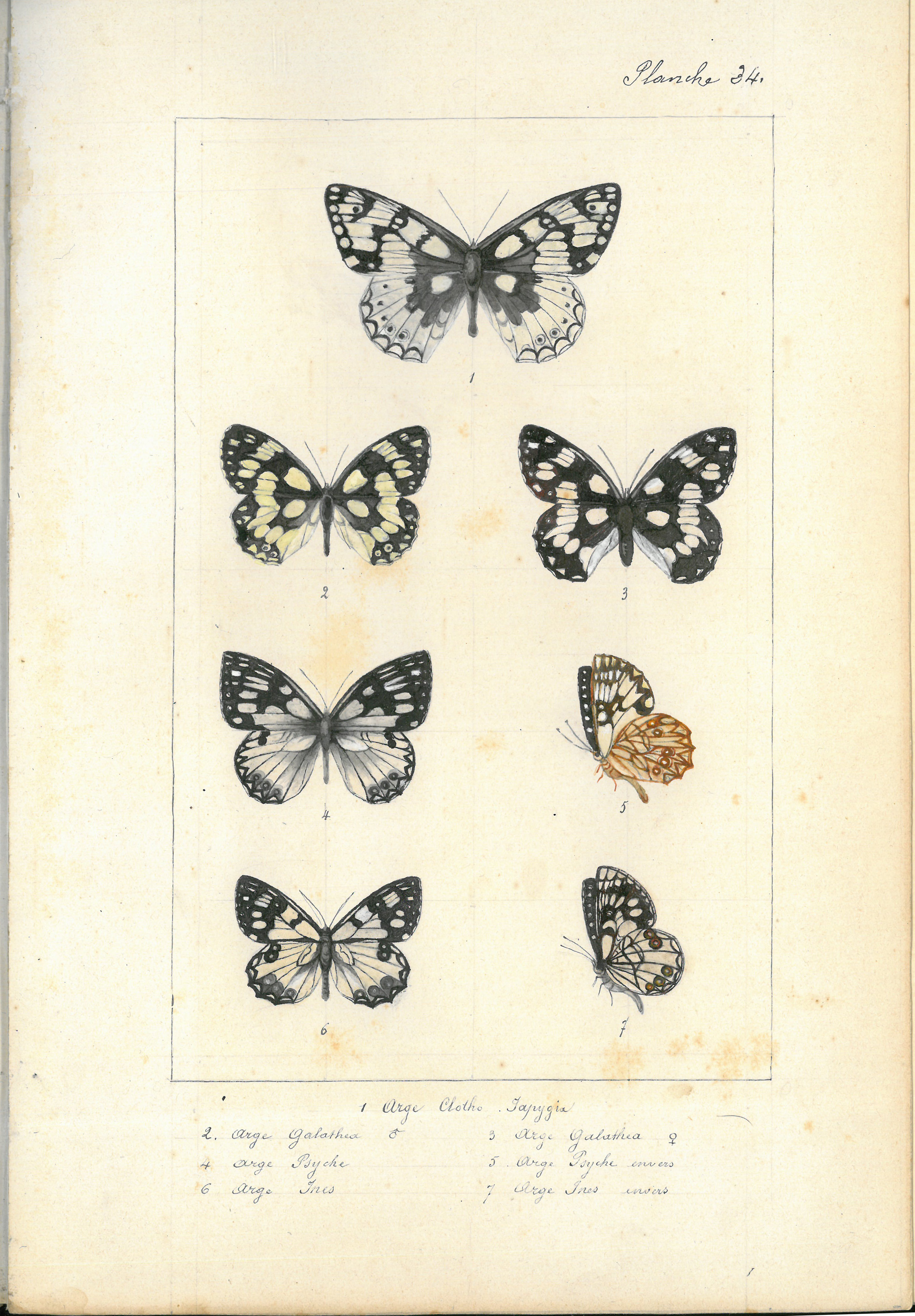 1-Arge Clotho Japygia. 2-Arge Galathea ♂. 3-Arge Galathea ♀. 4-Arge psyche. 5-Arge psyche envers. 6-Arge Ines. 7-Arge Ines envers.