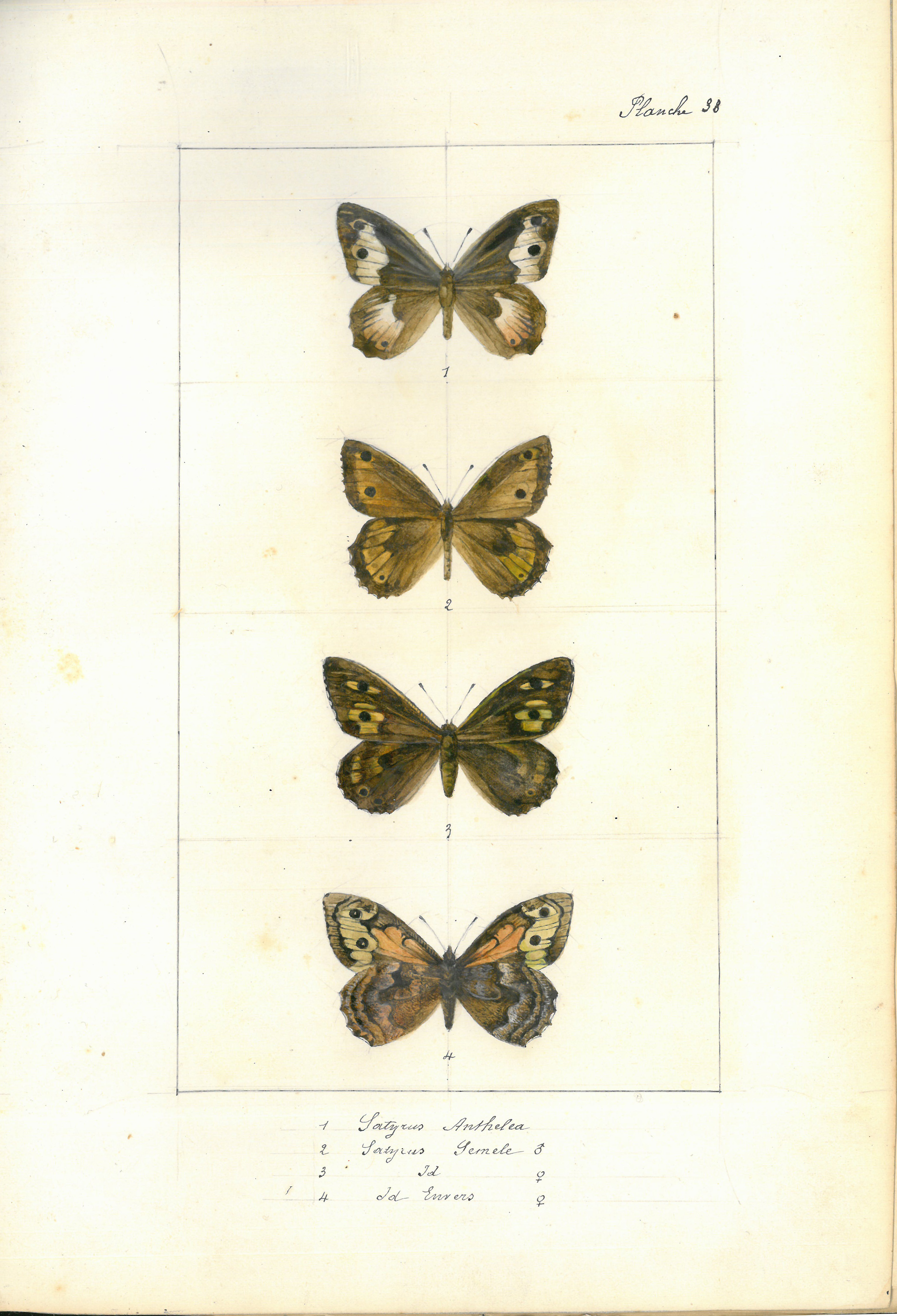 1-Satyrus Anthelea. 2-Satyrus Semele ♂. 3-Satyrus Semele ♀. 4-Satyrus Semele envers ♀