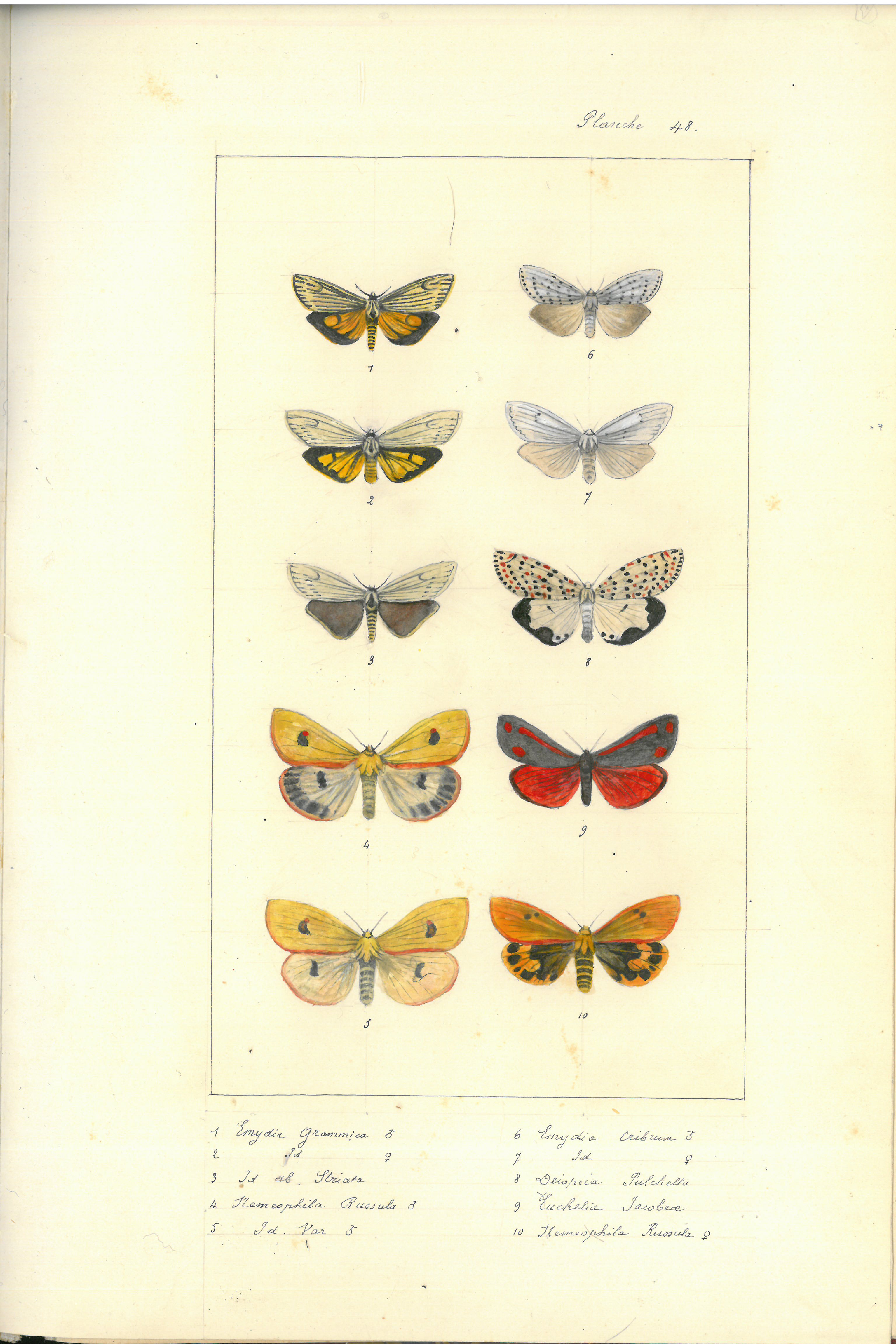 1-Emydia Grammica ♂. 2-Emydia Grammica ☺2. 3-Emydia ab. Striata. 4-Hemeophila Russula ♂. 5-Hemeophila var ♂. 6-Emydia Cribrum ♂. 7-Emydia Cribrum ♀. 8-Deiopeia Pulchella. 9-Euchelia Jacobex. 10-Hemeophila Russula ♀. |