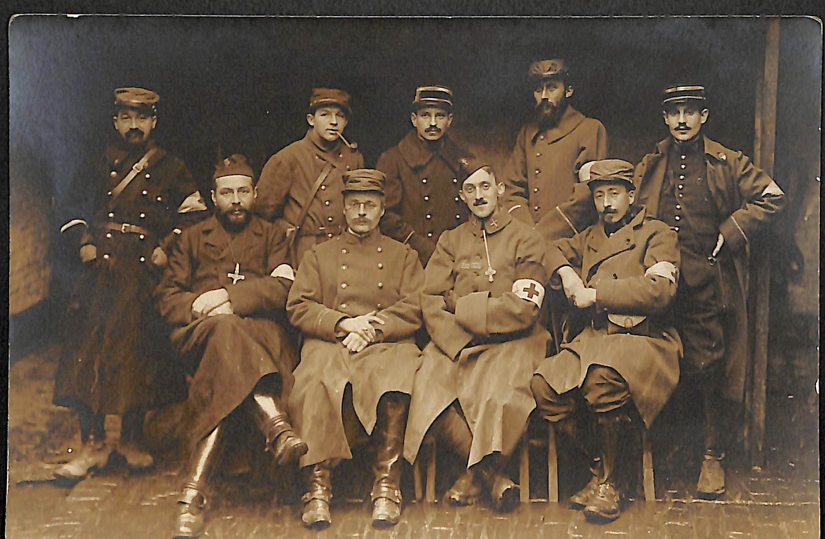 G.B.C. du 9ème corps d'armée - novembre 1914- deuxième section. 1er rang assis de gauche à droite :. . Aumonier Civrays. Médecin chef Drouet. Pasteur Lauga (aumonier protestant). Docteur Rousselot. . 2ème rang debout : . . Vaguemestre du groupe. Médecin auxiliaire "Corbelle"?. Médecin auxiliaire Blondier. Médecin auxiliaire Bodard. . |