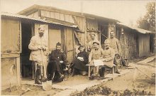 G.B.C. IX. . Dr Plasson. Aumonier Civrays. Aumonier Morcay. Officier gestionnaire Vaganay. Pharmacien Monceau. Nos cuisiniers: Hodeau, Tacoën. . Notre cagna (abris militaire) servant de popote (à Hans en Champagne). . |