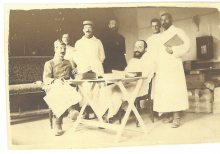 Aumonier Civray posant pour la photo avec les membres de l'ambulance réunit autour d'une table