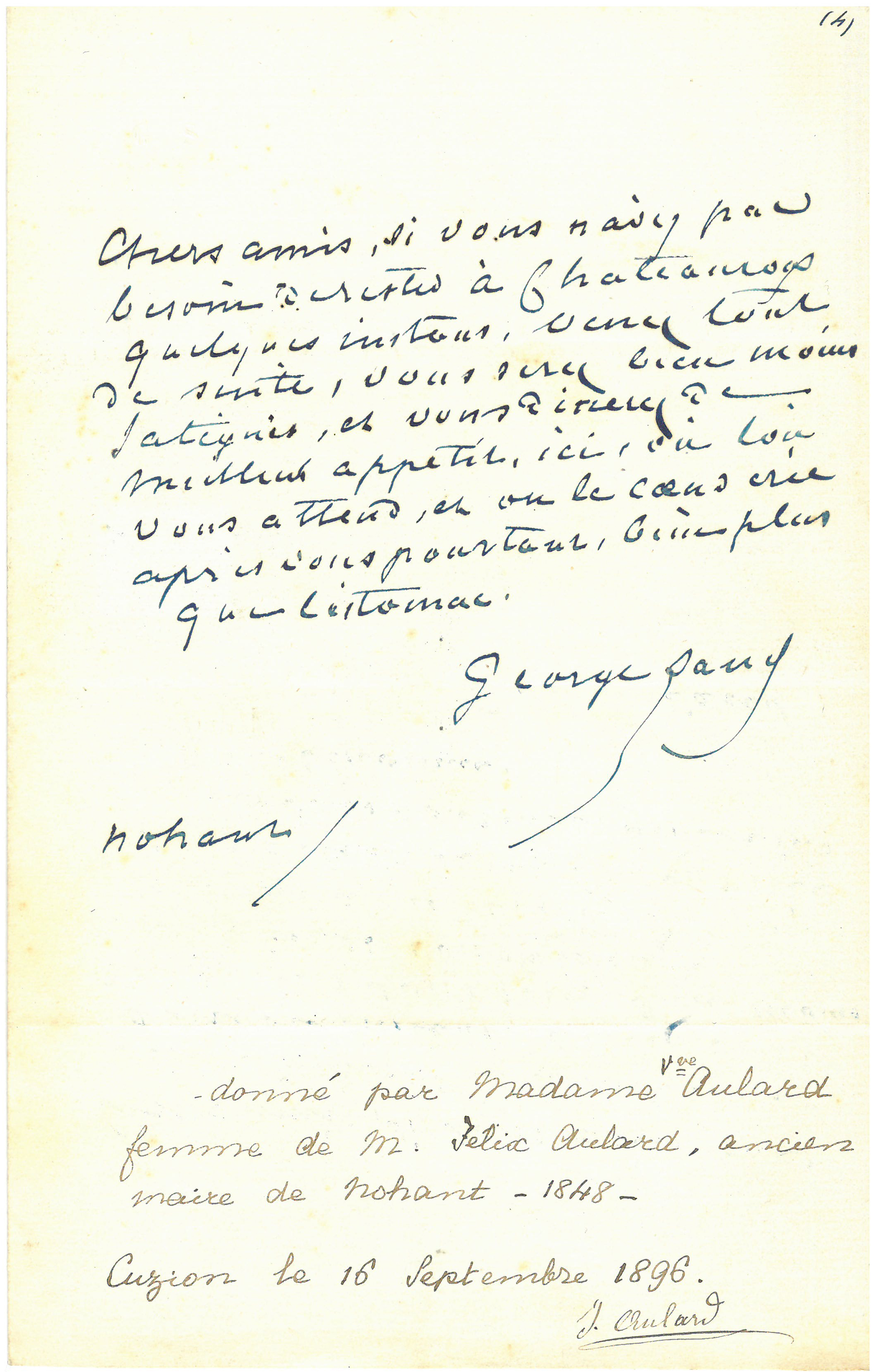 Donné par Madame veuve Aulard femme de Mr Félix Aulard, ancien maire de Nohant - 1848. Cuzion le 16 septembre 1896