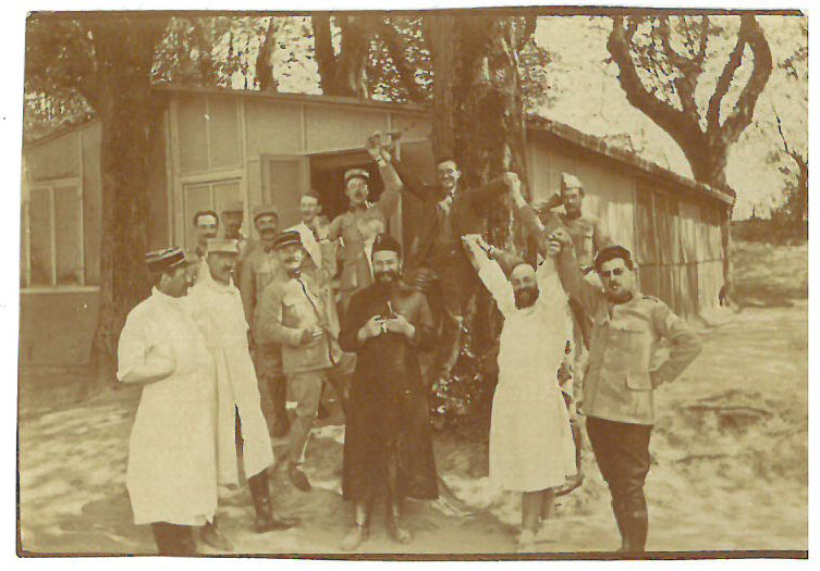 Photo de groupe. Aumonier Civrays. Ambulance et baraquement |