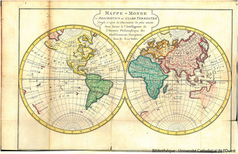 | Titre | Mappe-monde ou description du globe terrestre : dressée d'après les observations les plus exactes. Pour servir à l'intelligence de l'Histoire philosophique des établissements européens dans les deux Indes |