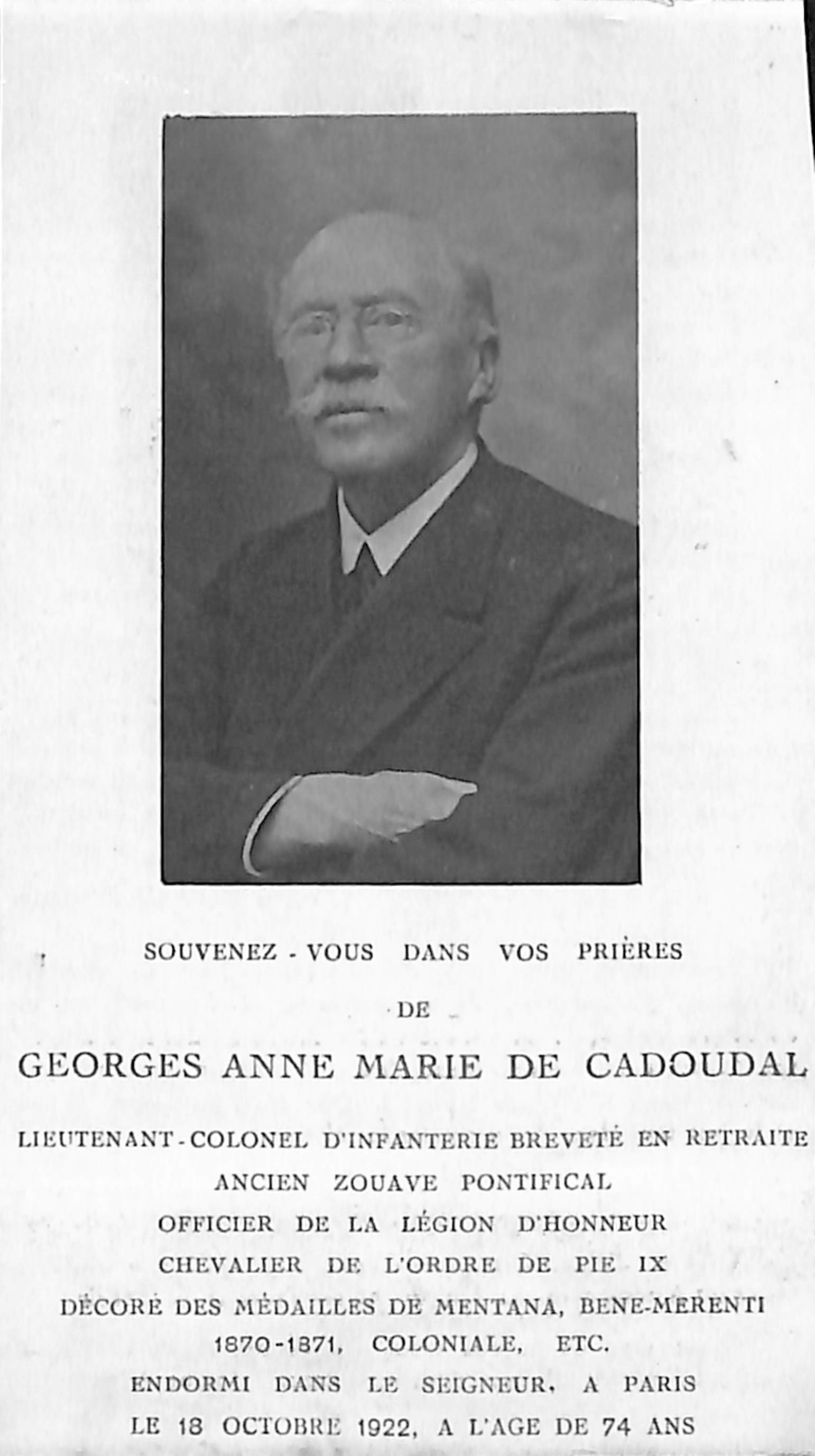 Lieutenant colonel d'infanterie. Ancien zouave pontifical. Officier de la Légion d'honneur. Chevalier de l'Ordre de Pie IX. Décoré des médailles de Mentana, Bene-Merenti 1870-1871. Décédé à Paris le 18 octobre 1922 à l'âge de 74 ans